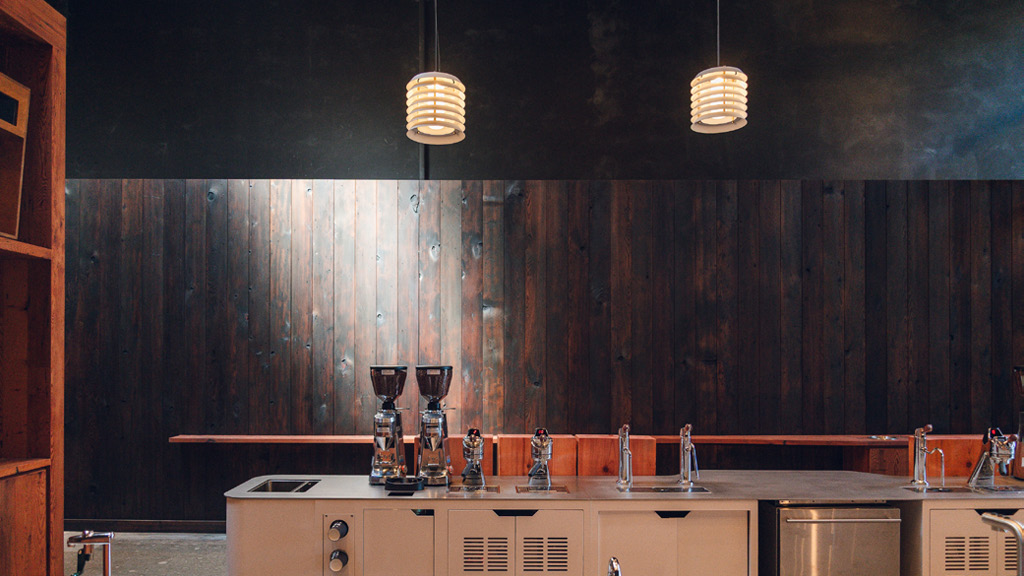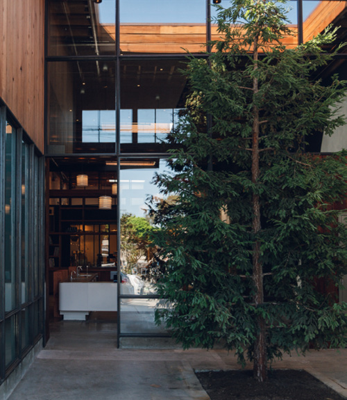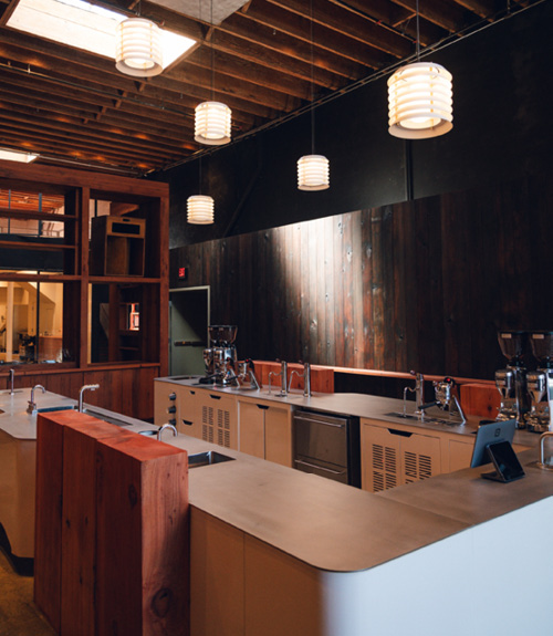 Hedge Coffee honed their craft serving at events from mobile espresso carts, roasting coffee in shared workspace. When they set about designing their own permanent home, we helped make it feel like a party, like a club. Inspired by the pine forests of the founders’ home countries, we created a woodsy dark space, a modern forest floor. A surprising opening in the roof creates a welcoming outdoor entry patio complete with a towering redwood tree.