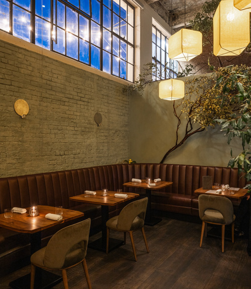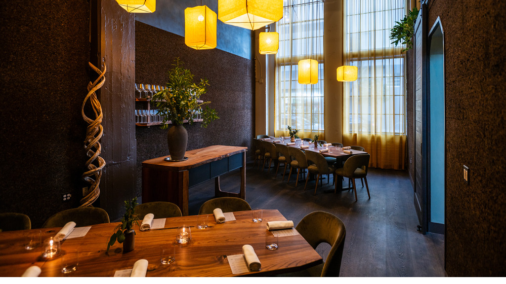 Wolfsbane is a mythical herb that can hold the inner werewolf at bay. This space was designed as the den of a feral beast that is not too far gone to indulge in a sophisticated feast. The dark cork walls help with acoustics, smell lightly of toasted tobacco, and evoke an earthen cave. Elm and redwood form the tables and show stations with a mixture of solid crisp detail and natural edges. The walls are a soft lime wash with accents of abstract artful paint in the tunnel entry and private dining.