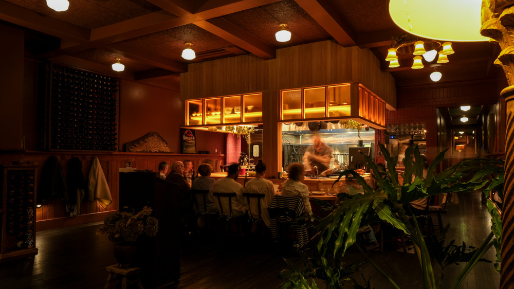 La Cigale focuses all of its culinary prowess on a single 14 seat cypress counter in front of a wood fired grill. Dark wood floors, rich red walls, redwood paneling and antique lighting make for a dramatic yet intimate setting.